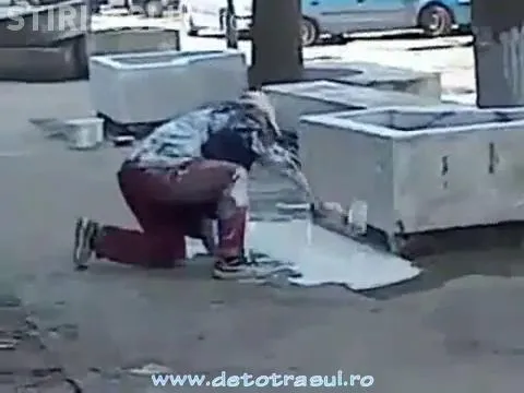 Un barbat extrem de beat a fost filmat in timp ce incerca sa vopseasca niste jardiniere pentru flori din Timisoara.