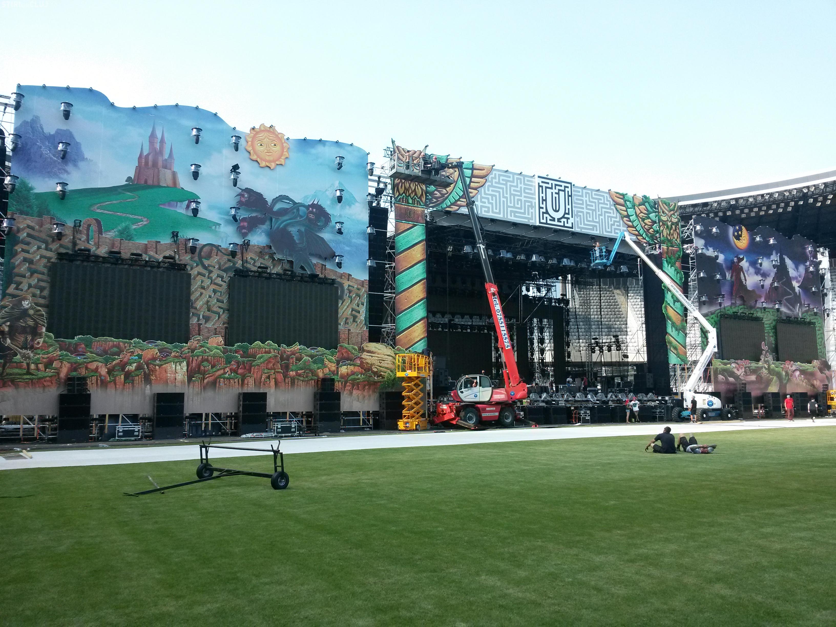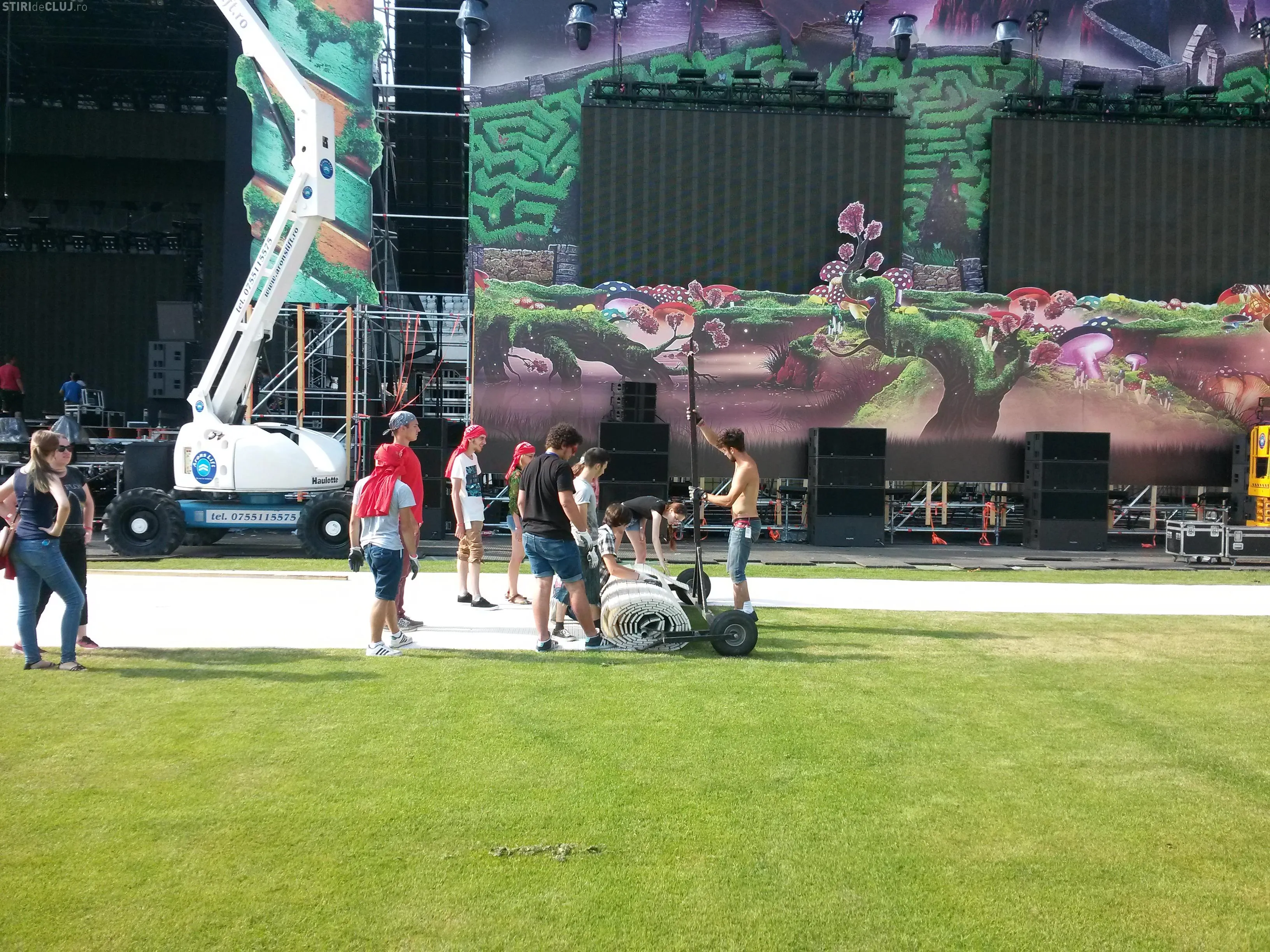 Muncitorii lucrau de zor și la montarea grass cover -ului, pentru a nu fi distrus gazonul în cele 4 zile de concerte.