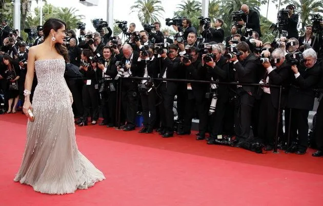 Salma Hayek a imbracat o rochie marca Gucci Premiere, de culoare gri prafuit, care a fost impodobita cu zeci de cristale.