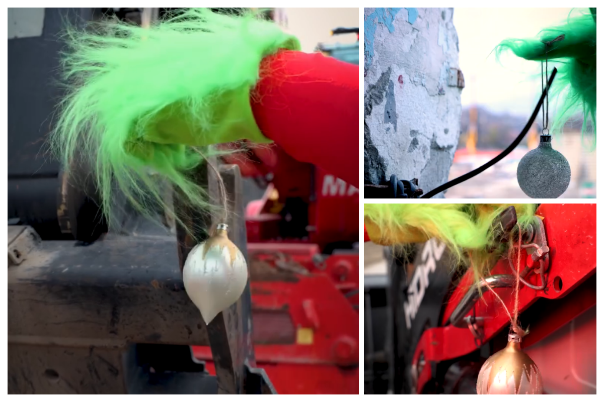 Plin de entuziasm, Grinch sună la poarta șantierului, intră hotărât și începe decorarea: agață globuri ici-colo, pe un excavator, pe o macara, pe o clanță sau pe alte utilaje grele. Cu fiecare glob pus la locul lui, șantierul capătă un strop de magie și sclipici.