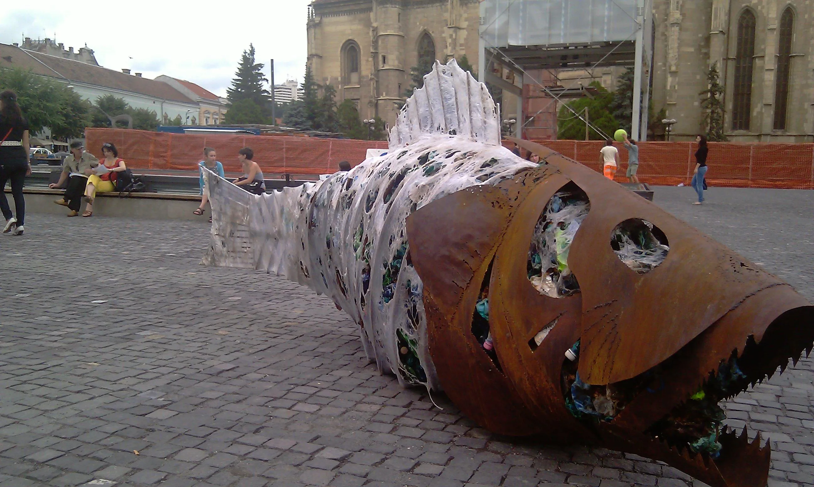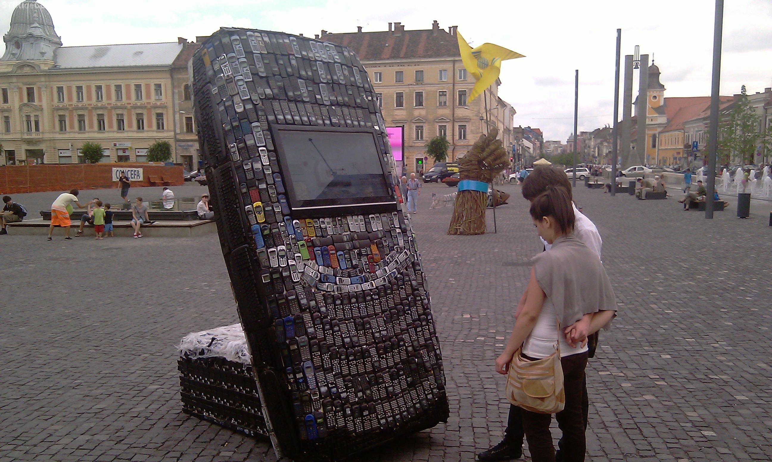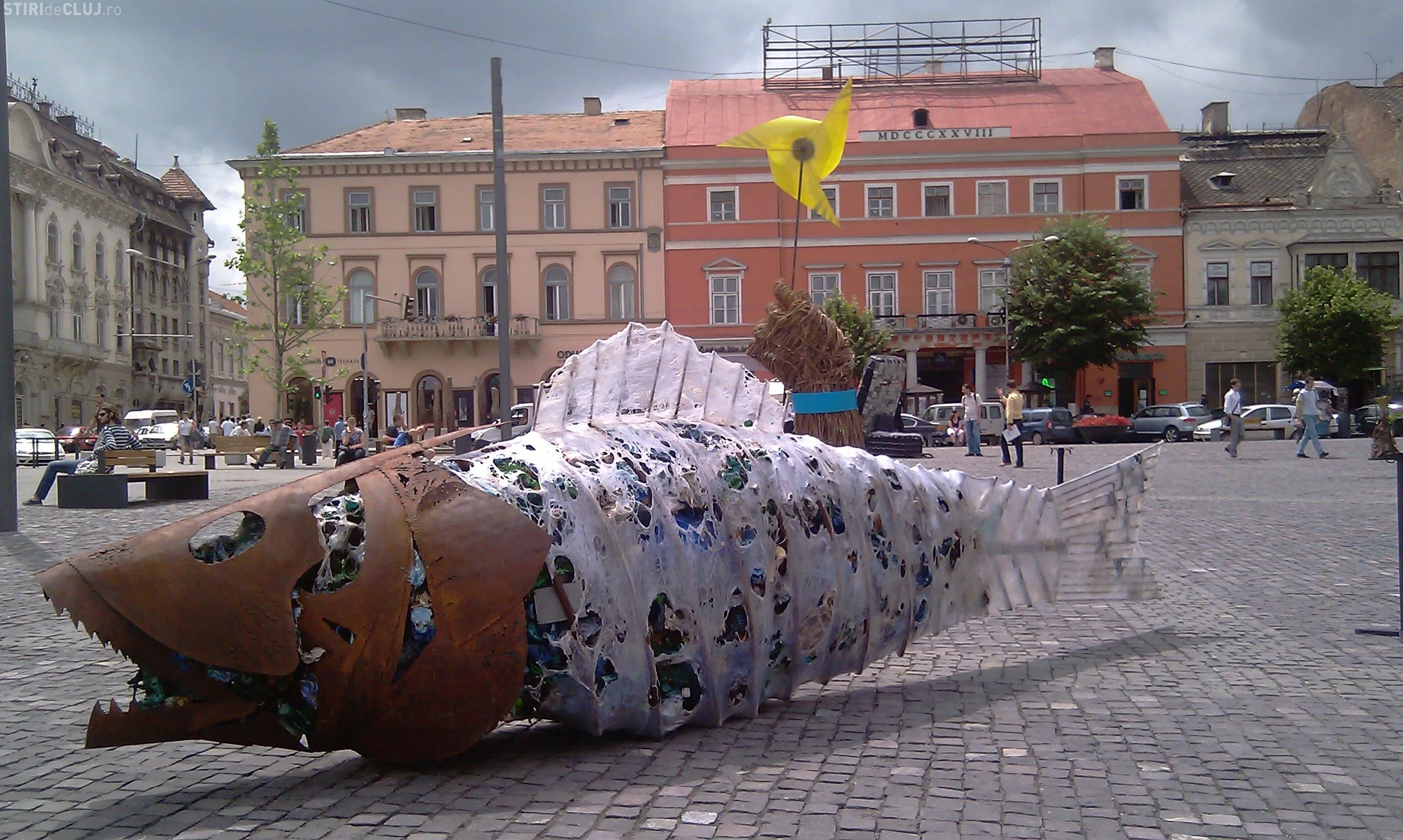 Festivalul de mediu si film ecologic "Planeta Report" va incepe la ora 18.00 cu o expozitie de statui gigant, realizate din deseuri. In prim plan este un telefon Nokia facut din alte "mobile" defecte sau un peste care "transporta" PET - uri.