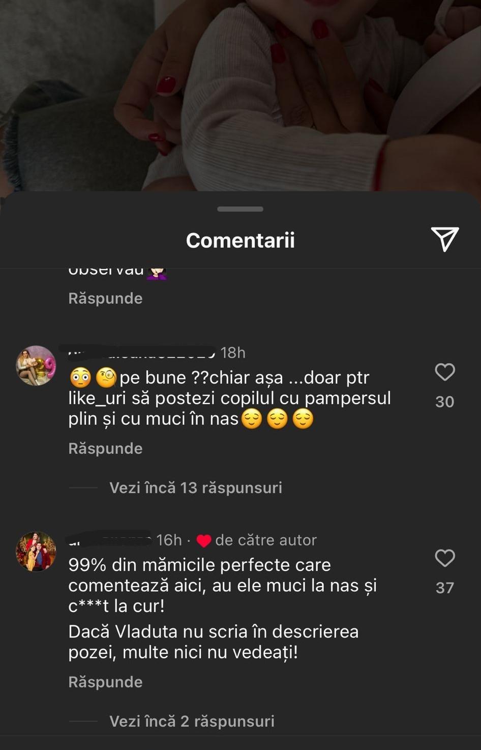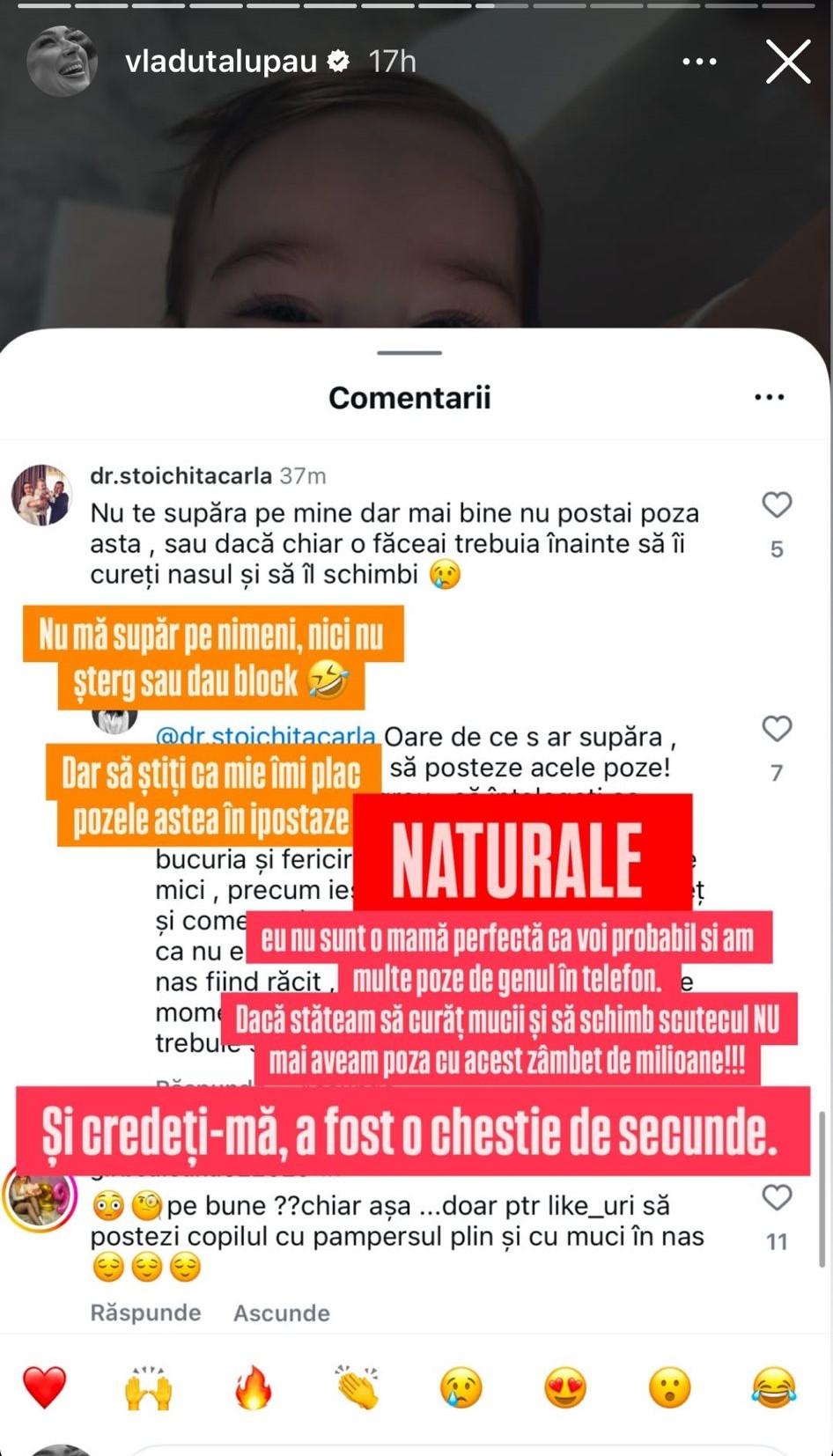 „Nu mă supăr pe nimeni și nici nu șterg sau dau block. Dar să știți că mie îmi plac pozele astea în ipostaze naturale. Eu nu sunt o mamă perfectă ca voi, probabil, și am multe poze de genul în telefon. Dacă stăteam să curăț mucii și să schimb scutecul, nu mai aveam poze cu acest zâmbet de milioane. Credeți-mă a fost o chestie de secunde.”, a scris Vlăduța Lupău pentru a-și calma fanii.