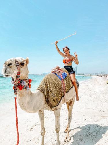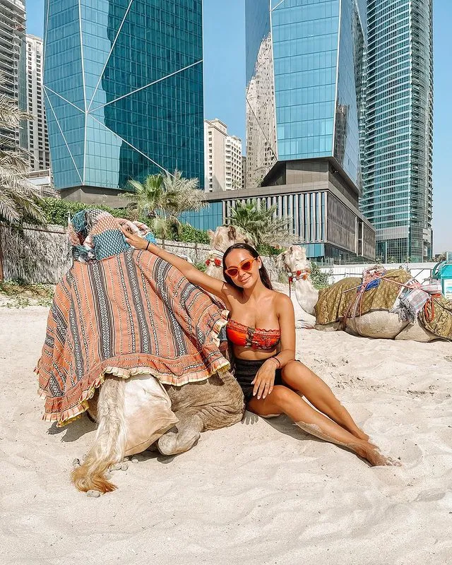 Frumoasa artistă s-a fotografiat pe o cămilă, lângă celebrul hotel Burj Al Arab.