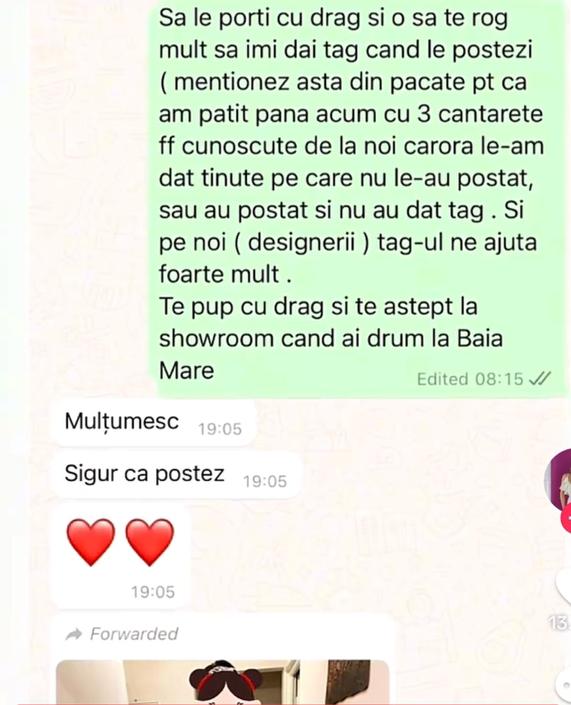 (...) În momentul în care această artistă a intrat în posesia ținutelor, le-a încercat și a fost mulțumită de ele, am îndrăznit să o rog frumos ca atunci când le postează să mă eticheteze, pentru că acest lucru este foarte important pentru noi.