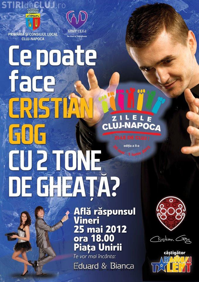 Castigatorul emisiunii Romanii au talent, Cristian Gog, va prezenta un numar cu adevarat spectaculos la Zilele Clujului, in aceasta dupa-amiaza, de la ora 18.00, in Piata Unirii. Magicianul va folosi 2 tone de gheata.