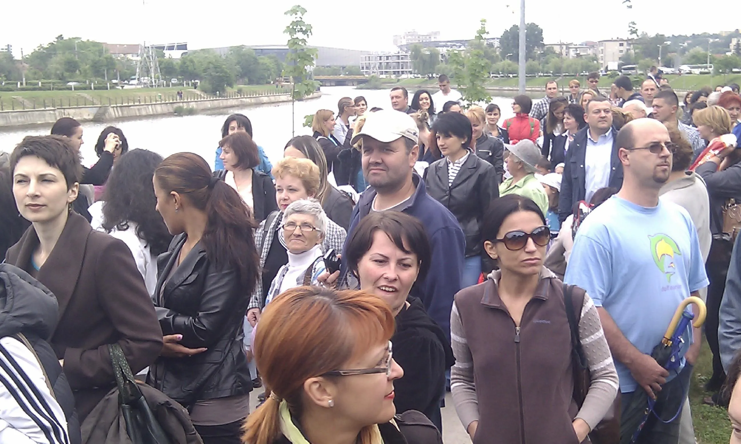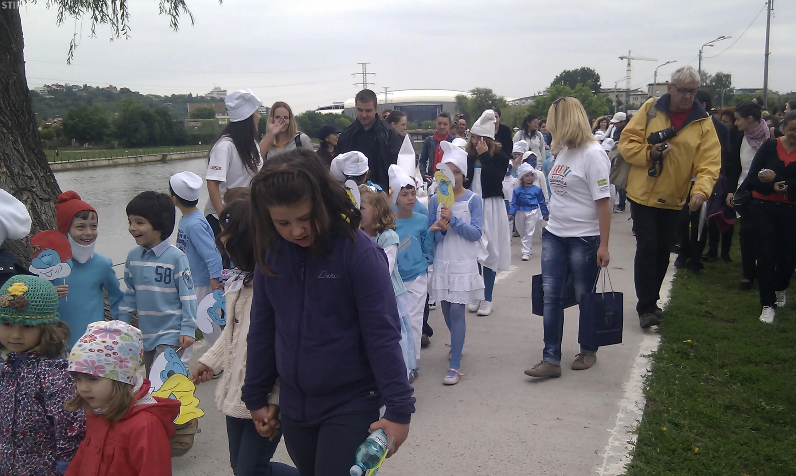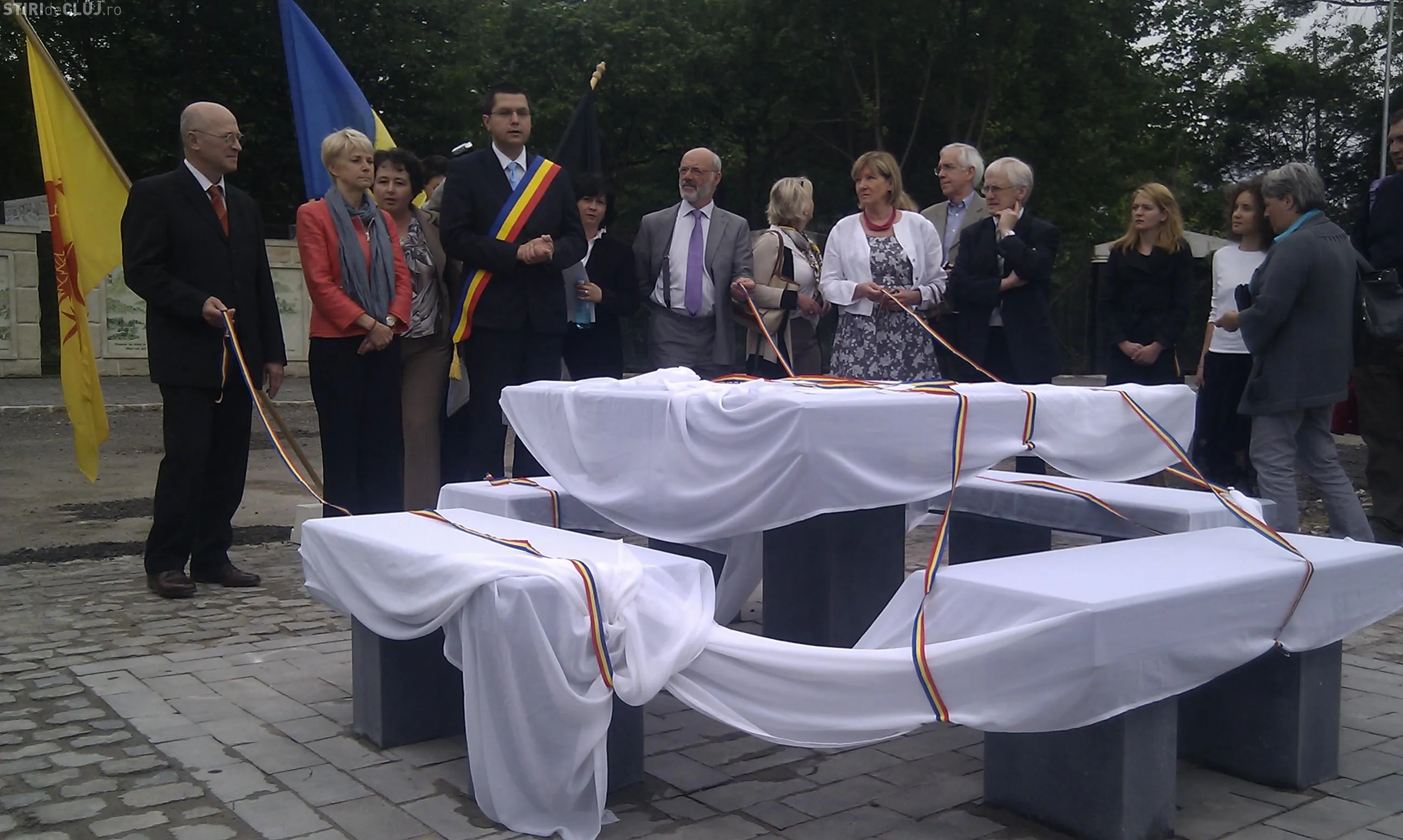 "Este o parada a stumfilor oferita delegatiei belgiene invitata de onoare la Zilele Clujului, editia a doua. Suntem pe promenada Somesului, promenada oraselor infratite, unde vom inaugura un monument primit cadou de la orasul infratit din Belgia, Namur.