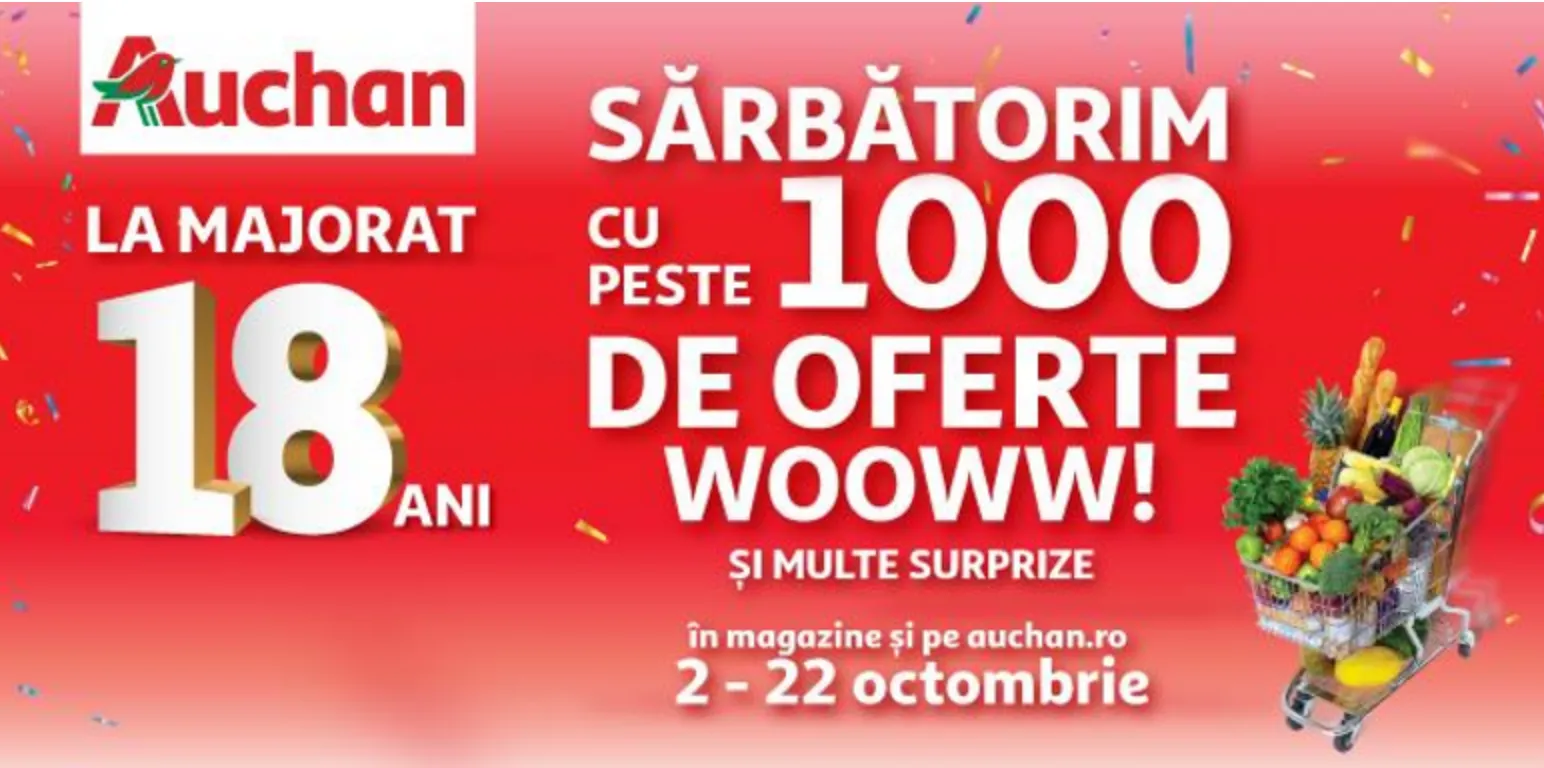 Auchan România sărbătorește luna aceasta 18 ani de prețuri mici zi de zi, de parteneriate durabile cu producători locali, de inovație și responsabilitate cu o sărbătoare de oferte. În toate magazinele Auchan, clienții vor putea beneficia de peste 1.000 de oferte, promoții puternice și avantaje extra prin cardul de fidelitate MyCLUB Auchan. Mai mult, retailerul își sărbătorește majoratul cu o tombolă aniversară în cadrul căreia este oferit marele premiu în valoare de 18.000 euro și readuce în magazine o nouă ediție a Cărucioarelor Misterioase.