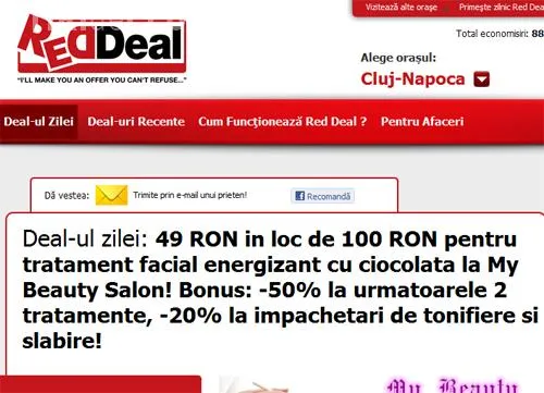 Oferta pe care o gasiti pe Red Deal include si o reducere de 50 % pentru urmatoarele doua tratamente facile, precum si o reducere de 20% la impachetari pentru tonifiere si slabire la My Beauty Salon din Cluj.