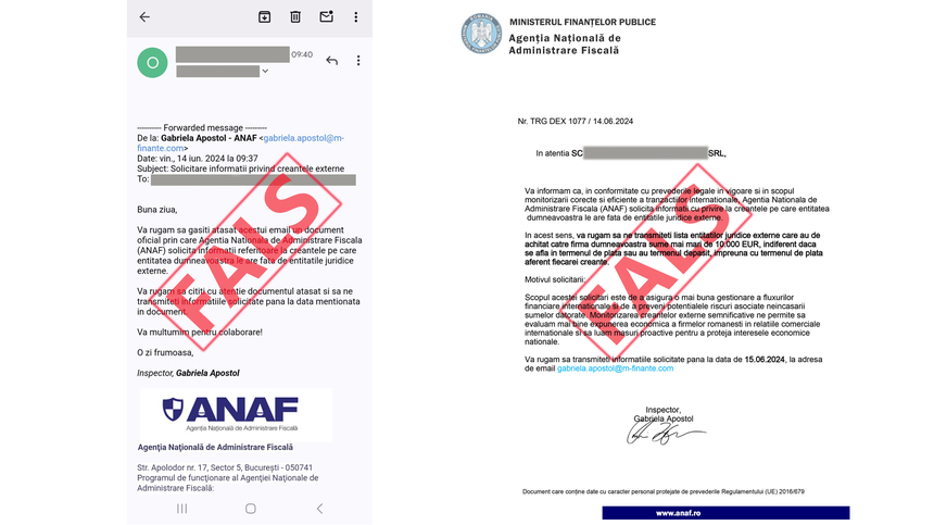 Totuși, ANAF face clar că nu solicită astfel de date și nici nu intervine în relațiile comerciale dintre persoanele juridice. Mesajele sunt trimise de la adresa de e-mail gabriela.apostol@m-finante.com, dar ANAF avertizează că această adresă nu aparține instituției și cere contribuabililor să nu răspundă acestor solicitări.