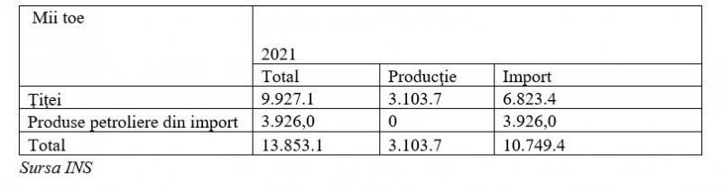 a) România este o țară care conform INS în anul 2021 a consumat 13.853,1 mii tone produse petroliere (țiței brut rafinat în Romania și produse petroliere rafinate importate din alte țări), fiind dependentă în proportie de 78% de importuri.