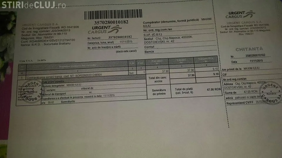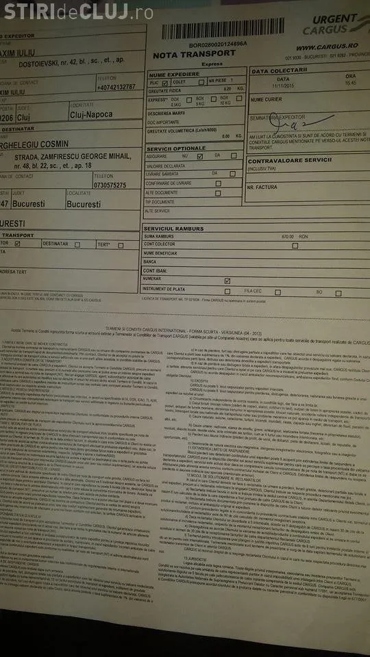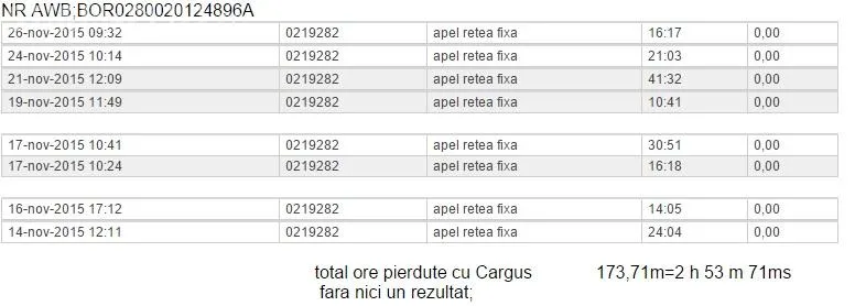 ”Am doua reclamatii facute in data de 14 noiembrie si 19 noiembrie telefonic la 021/9282 fara nici un raspuns de la Cargus!! Mentionez ca la punctul de lucru din Cluj mi s-a spus ca sunt doar 2 posturi; receptionera coletelor si cel din depozit si nu am la cine sa fac reclamatie in afara de cei pe care i-am mentionat! Mai jos va atasez lista convorbirilor telefonice cu data, ora si durata din care reiese de cate ori am sunat, nota de transport (awb) si factura cu chitanta. Mentionez ca i-am sunat si aztazi (2 decembrie), dar convorbirea de aztazi imi apare doar dupa 72 de ore pe factura detaliata! Declar pe propria raspundere ca lista detaliata de mai jos este a numarului 07421327.., care este detinut de mine personal si este pe numele meu!!!”, ne-a mai spus clujeanul.