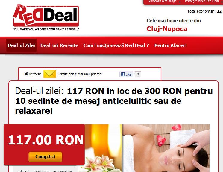 Timp de trei zile puteti cumpara 10 sedinte de masaj anticelulic la un pret mai mic cu 61%, fata de pretul normal. Oferta va este oferita de Red Deal si Cabinetul de Masaj şi Terapii Complementare Lotus din Cluj-Napoca.