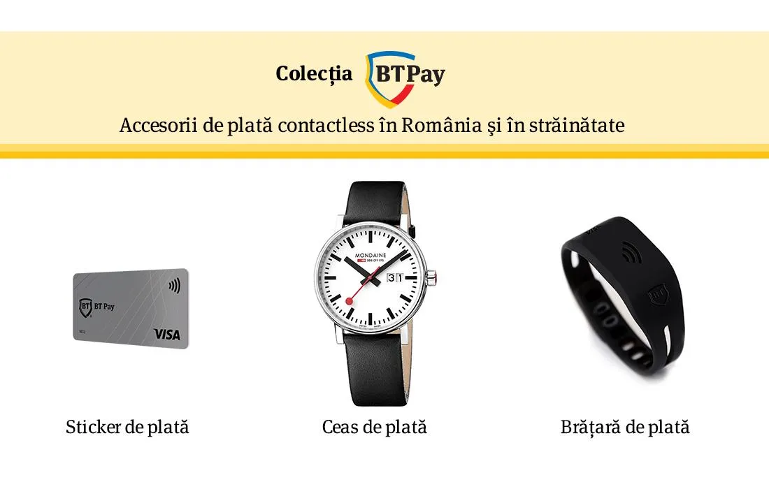 Stickerul, Brățara şi Ceasul BT sunt accesoriile de plată contactless din Colecția BT Pay, colecție pe care clienții băncii o au la dispoziție pentru cumpărături în țară şi în străinătate. Ca noutate față de celelalte accesorii, stickerul poate înlocui atât un card de debit BT, cât şi cardurile de credit Star Forte, Star Gold (carduri BT de cumpărături) şi Flying Blue Premium (card BT de călătorii).