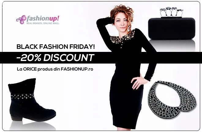 Bucureşti, 19 noiembrie, 2012: FashionUp.ro se alătură conceptului Black Friday din 23 noiembrie oferind un discount de 20% la toate produsele. Reducerea se aplică la peste 30.000 de produse, inclusiv la cele care au deja preţurile reduse. Campania va fi activă în data de 23 noiembrie 2012, de la ora 00:00 până la 23:59.