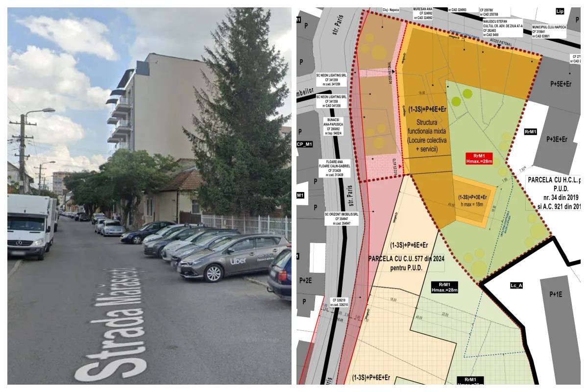 Terenul este situat într-o zonă clasificată urbanistic drept RrM1 – parcelar riveran principalelor artere, conform Planului Urbanistic General (PUG) al municipiului Cluj-Napoca. Este o zonă mixtă destinată restructurării, cu regim de construire închis, ceea ce permite construirea în aliniament, pe toată lățimea parcelei, în stil „front urban” continuu. Aici se încadrează perfect propunerea investitorului: un imobil masiv, care va ocupa un teren semnificativ, înconjurat de străzile Paris și Mărășești – două axe deja suprasolicitate din punct de vedere al traficului și infrastructurii.