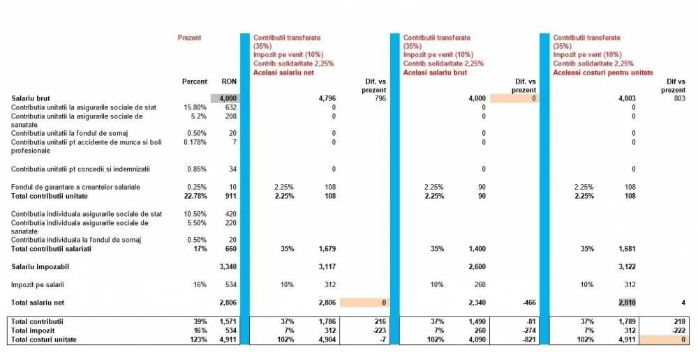 3. Al treilea scenariu este de transfer al contribuţiilor sociale în sarcina angajatului, alături de reducerea impozitului pe venit la 10%, alături de introducerea taxei de solidaritate, dar realizate cu păstrarea costului angajatorului neschimbat. În acest caz, salariul brut ajunge la 4.803 lei, iar salariul net creşte la 2,810 lei, o majorare de numai 6 lei, conform ZF.ro.