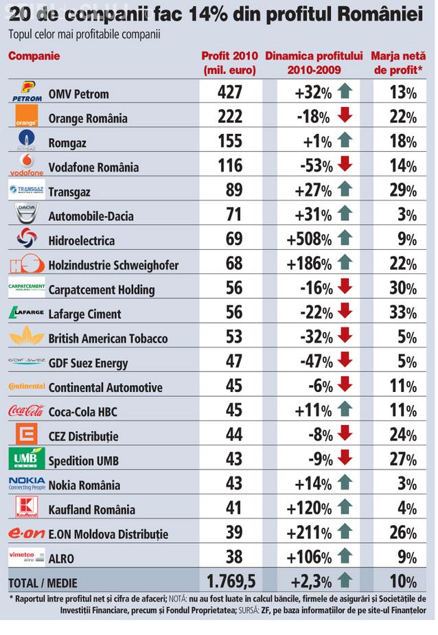Cea mai profitabila companie este OMV Petrom, care a obtinut un profit net de 427,4 milioane euro in 2010. Locul secund este ocupat de Orange Romania, cu un profit de 222 milioane de euro, iar pe trei este Romgaz, cu 155 de milioane de euro, anunta zf.ro.