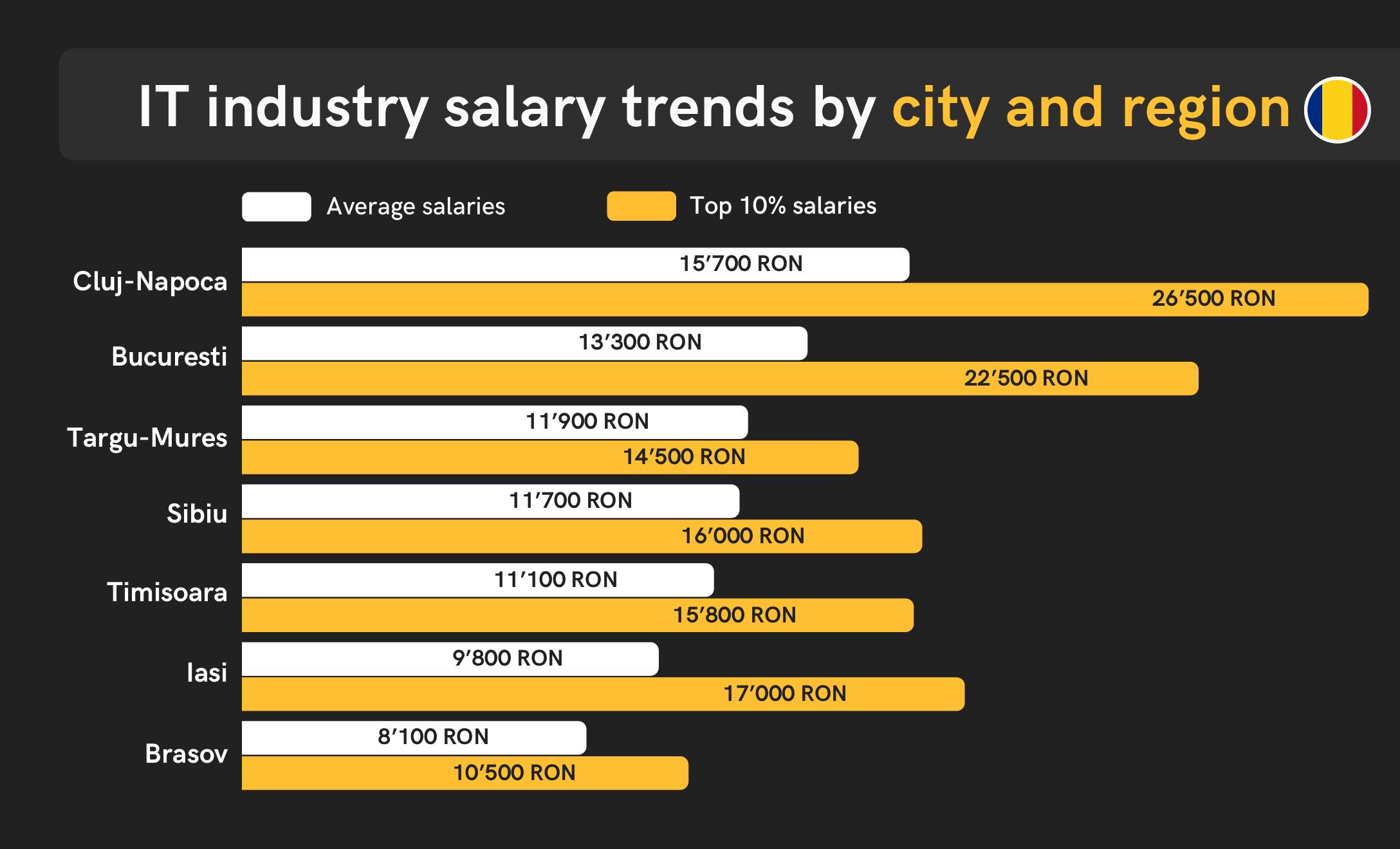 Există așadar diferențe semnificative între orașe și regiuni, iar cei care sunt dispuși să se deplaseze într-un oraș precum Cluj-Napoca sau București pot beneficia de salarii mult mai mari, mai ales în topul 10% din industrie.