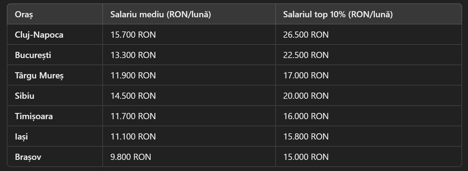 În România, salariile IT variază considerabil în funcție de orașul în care lucrezi. Iată câteva exemple de salarii medii lunare pentru diferite orașe: