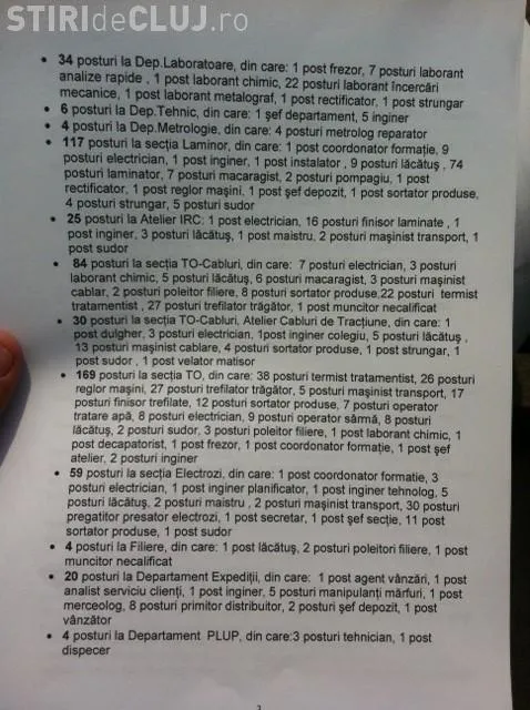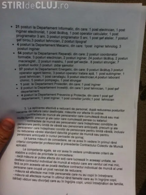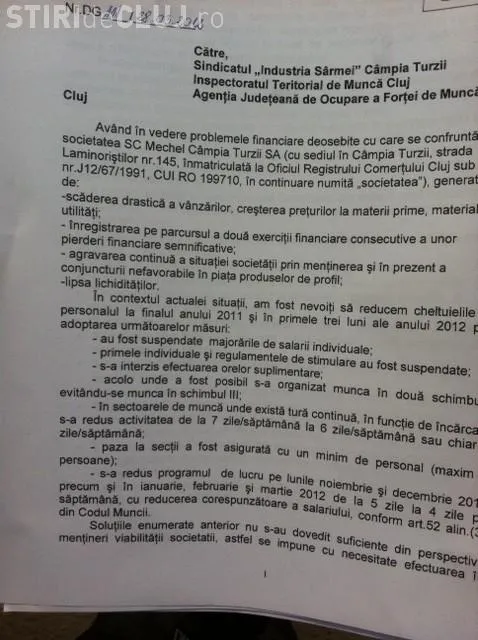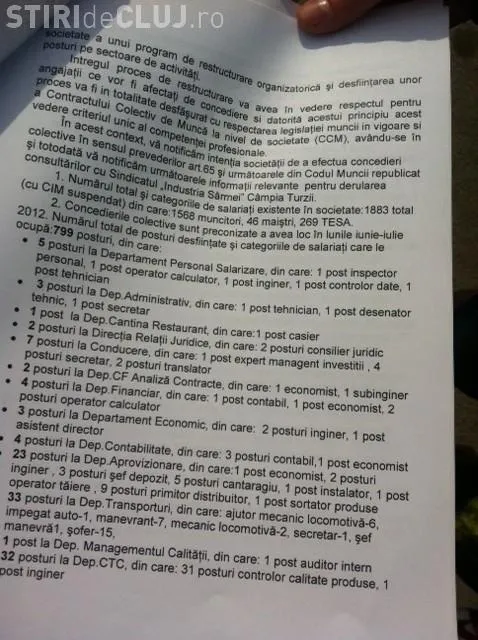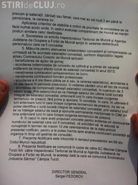 El a mai precizat in notificarea de disponibilizare trimisa la AJOFM Cluj si ITM Cluj ca, din cauza crizei economice, compania a fost nevoita sa reduca drastic cheltuielile. "Au fost suspendate majorarile de salarii individuale, primele individuale si regulamentele de stimulare au fost suspendate, s-a interzis efectuarea orelor suplimentare, acolo unde s-a putut s-a organizat munca in doua schimburi, evitandu-se munca in schimbul III, in sectoarele de munca unde exista tura continua, in functie de incarcare s-a redus activitatea de la 7 zile pe saptamana la 6 zile sau chiar 5 zile, paza la sectii a fost asigurata cu minim de personal, s-a redus programul de lucru pe lunile noiembrie si decembrie 2011, precum si in ianuarie, februarie si martie 2012, de la 5 zile la 4 zile", a enumerat Fedorov.
