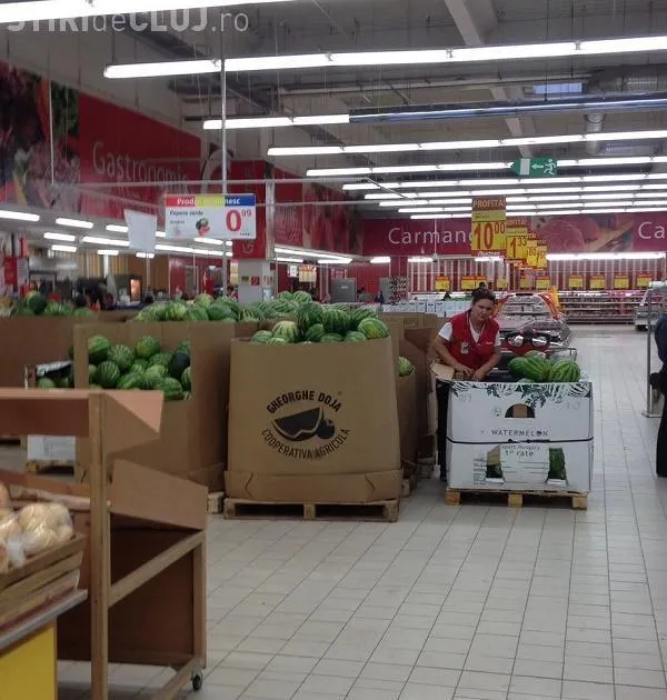 O angajată de la Auchan Cluj a fost fotografiată în timp ce punea pepeni ungurești într-un container pe care scria produs românesc.