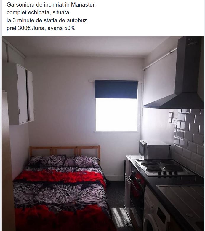 ”300 de euro ca să dormi la jumătate de metru de aragaz. Și mai sunt unii care zic că piața nu a luat-o razna. Este posibil ca imaginea să conţină: interior”, scriu cei de la Asociația Chiriașilor Cluj.