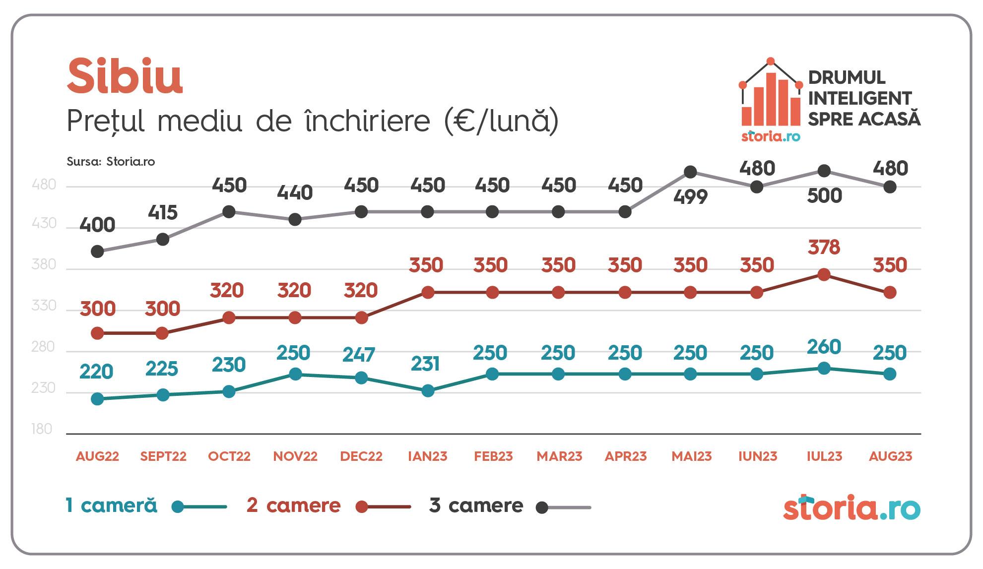 Comparativ cu luna august a anului trecut, la nivelul țării s-au înregistrat preponderent creșteri ale prețului mediu solicitat pe toate categoriile de apartamente, cu o singură excepție în cazul garsonierelor din Oradea, al căror preț mediu de închiriere a rămas constant față de anul trecut. În același timp, Cluj-Napoca este singurul oraș în care prețurile au rămas constante la toate categoriile de apartamente în luna august 2023, comparativ cu luna iulie 2023. Tot în categoria excepțiilor se încadrează și orașul Sibiu, care este singurul în care s-au înregistrat scăderi ale prețurilor de închiriere în luna august 2023, la toate categoriile de apartamente, comparativ cu luna iulie 2023. Constanța este orașul cu cea mai mare creștere de la lună la lună (august 2023 vs. iulie 2023), la categoria garsonierelor (+8%).