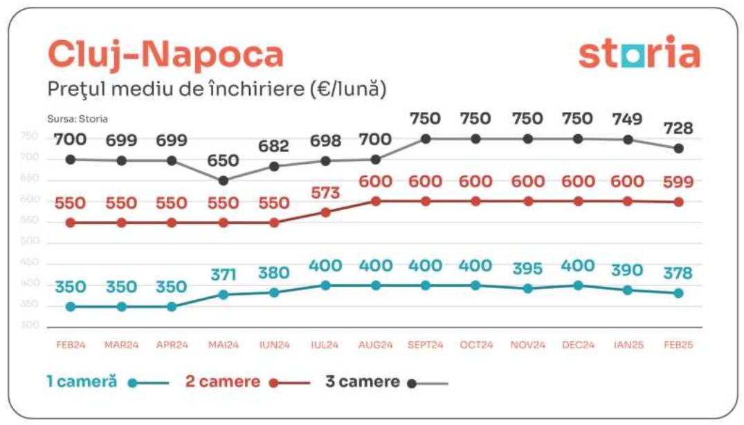 În cifre concrete, o garsonieră în Cluj-Napoca a avut în luna februarie un preț mediu de 378 de euro/lună, în timp ce chiria unui apartament cu două camere a ajuns la 599 de euro/lună. Pentru apartamentele cu trei camere, prețul mediu a fost de 728 de euro/lună, evidențiind o temperare a ritmului de creștere în comparație cu alți ani.