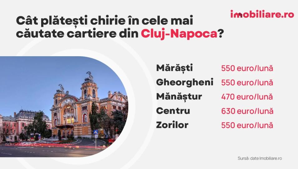 Cinci zone ies puternic în evidență în preferințele potențialilor chiriași din Cluj-Napoca. Cel mai atractiv cartier, Mărăști, nu este și unul dintre cele mai ieftine din oraș. Proprietarii solicită, în medie, o chirie de 550 euro/lună pentru apartamente. În cartierul unde sunt cele mai mici chirii, Someșeni, e nevoie de mai puțin de 400 euro/lună pentru o locuință. Locul al doilea este ocupat de Gheorgheni, iar pe poziția a treia în clasamentul preferințelor chiriașilor din Cluj-Napoca se află Mănăștur. Zona centrală a orașului atrage, de asemenea, un număr important de potențiali chiriași. Chiria medie solicitată de proprietari pentru un apartament este de 630 euro/lună. Cartierul Zorilor din sudul orașului ocupă locul al cincilea în topul preferințelor clujenilor, chiria medie fiind de 550 euro/lună, potrivit datelor Imobiliare.ro.
