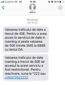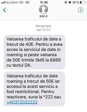 La scurt timp primesc alt mesaj: ”Valoarea traficului de date a trecut de 40E. Pentru a avea acces la serviciul de date in roaming si peste valoarea de 50E trimite SMS la 8888 cu textul DA”. Imediat după (cred ca nici 2 min distanță) am primit mesajul ”Valoarea traficului de date roaming a trecut de 50E iar accesul la acest serviciu a fost restrictionat. Pentru reactivare, suna la *222 sau +40372022222”. Și așa ”am acumulat” 49,1€ cost suplimentar in ROMÂNIA.