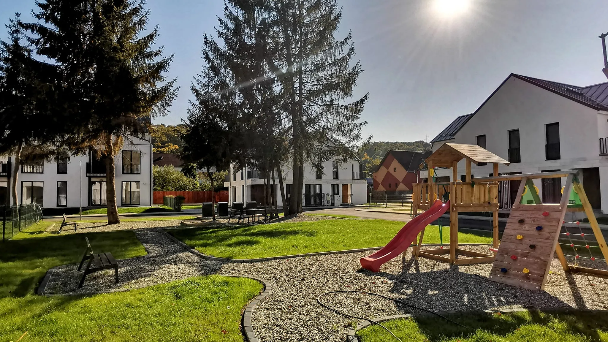 Exemplul prezentat era a unui ansamblu de case situat în comuna Gilău, județul Cluj. Între timp s-a realizat și cred că spațiul verde comun (de 2.300 mp) destinat activităților comune ale rezidenților este exact ceea ce trebuie. Adică un spațiu unde se poate coagula o comunitate (un spațiu pentru dialog, pentru relaxare și joacă). Un loc pentru oameni!