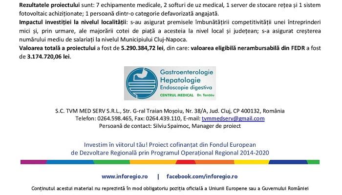 S.C. TVM MED SERV S.R.L., în calitate de beneficiar, comunică finalizarea proiectului „Dotare centru medical Gastroenterologie”, cod SMIS 110126.