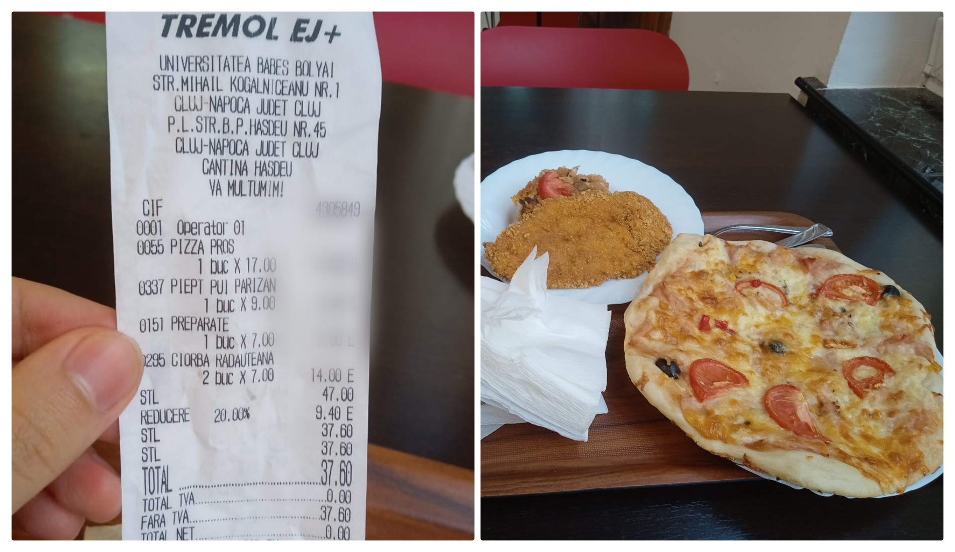 Tot ce e pe masă a costat 37 de lei, adică o pizza, două supe și un șnițel cu salată. Trei oameni mănâncă lejer din atâta mâncare, iar prețul este mai mult decât ok pentru Cluj. ”Prețul e WOW. Doamne ajută!”, a spus studentul fericit.