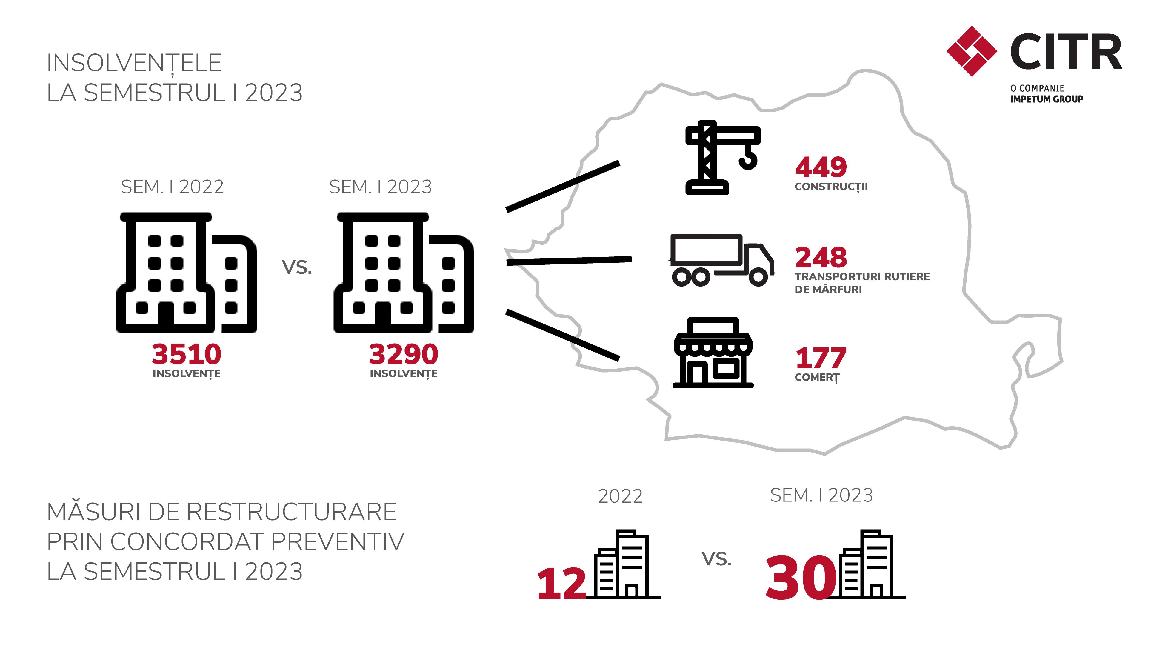 Mariana Boiciuc, partener în cadrul CITR: La nivelul primului semestru am avut o ușoară scădere a numărului de companii care au apelat la soluțiile procedurii de insolvență. Aparent e un semnal bun pentru economie. Dacă în aceeași perioadă a anului trecut au fost 3.510 de companii în insolvență, anul acesta am observat o reducere cu 6.2% a numărului la 3.290. Variația este marginală, într-adevăr, însă știm că relevanță prezintă fenomenele care se întâmplă în rândul companiilor de impact, adică acele companii care aduc plus valoare în economie prin prisma cifrei de afaceri generate, a locurilor de muncă pe care le oferă și a valorii activelor patrimoniale angajate în activitatea operațională. Iar în privința acestora, putem spune că în primele 6 luni ale anului trecut au intrat în insolvență 32 de companii de impact, în timp ce anul acesta, în aceeași perioadă, 35. Observăm, așadar, o ușoară creștere în această zonă. Și aici credem noi că e de urmărit ce se întâmplă, pentru că reverberațiile în ecosistemul de business sunt generate practic de aceste companii. Și, pentru că tot menționăm cifra de afaceri, nivelul agregat generat de companiile de impact intrate în insolvență în primele 6 luni ale anului 2022 a fost de 238 milioane de euro, pe când în primul semestru din 2023, acesta a ajuns la 280 milioane de euro, în creștere cu 18%.