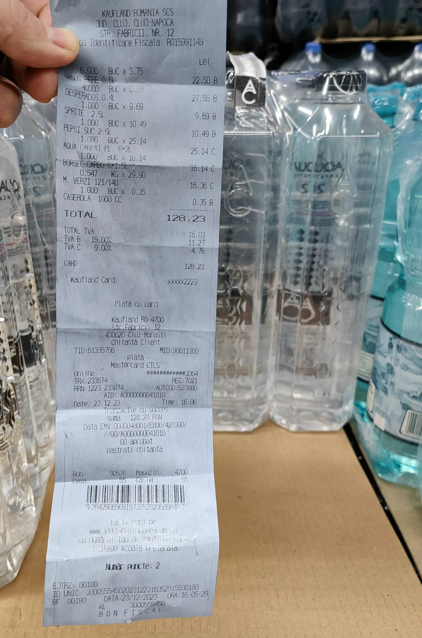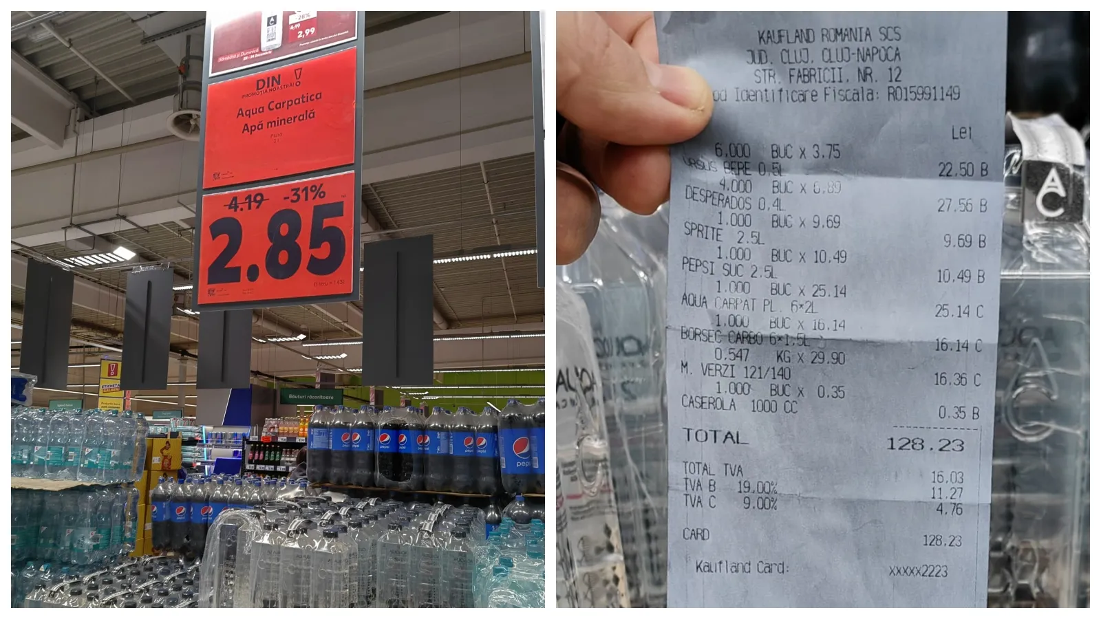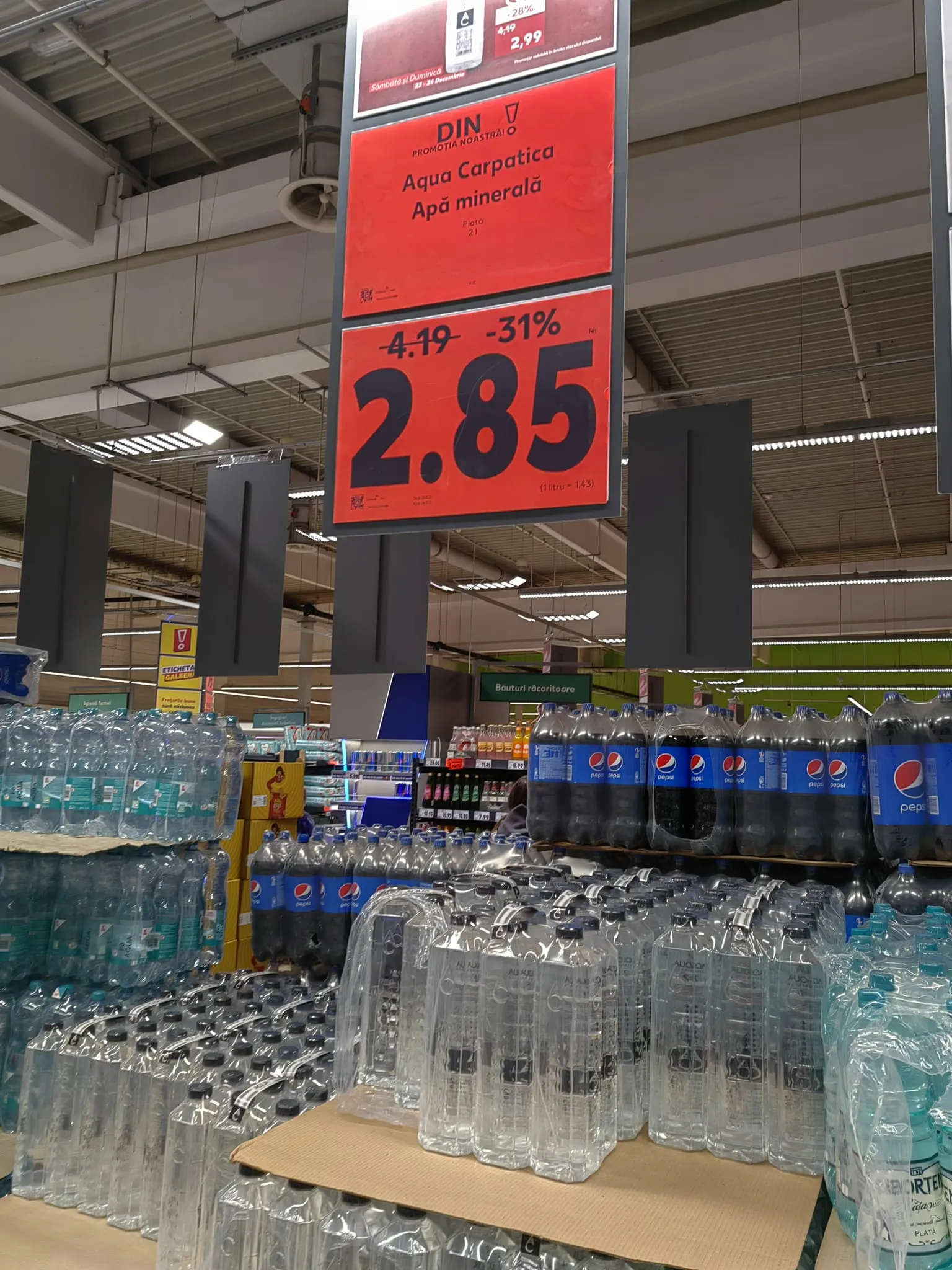 ”La Kaufland Mărăști, apa plată la 2 litri Aqua Carpatica este la promoție la 2,85 lei de la 4,19, dar la casele de marcat nu se face reducerea. Era aproape gol unde era Aqua Carpatica. A cumpărat foarte multă lume.