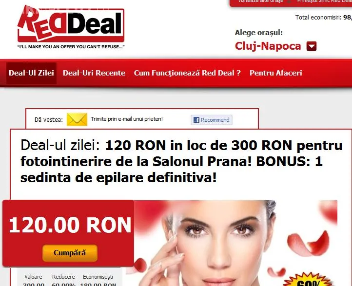 Reddeal te "intinereste" cu o reducere de 60% la fotointinerire. Daca va achizitionati cuponul de reducere de la Reddeal veti plati 120 de lei in loc de 300 de lei pentru 3 sedinte de fotointinerire la salonul Prana.
