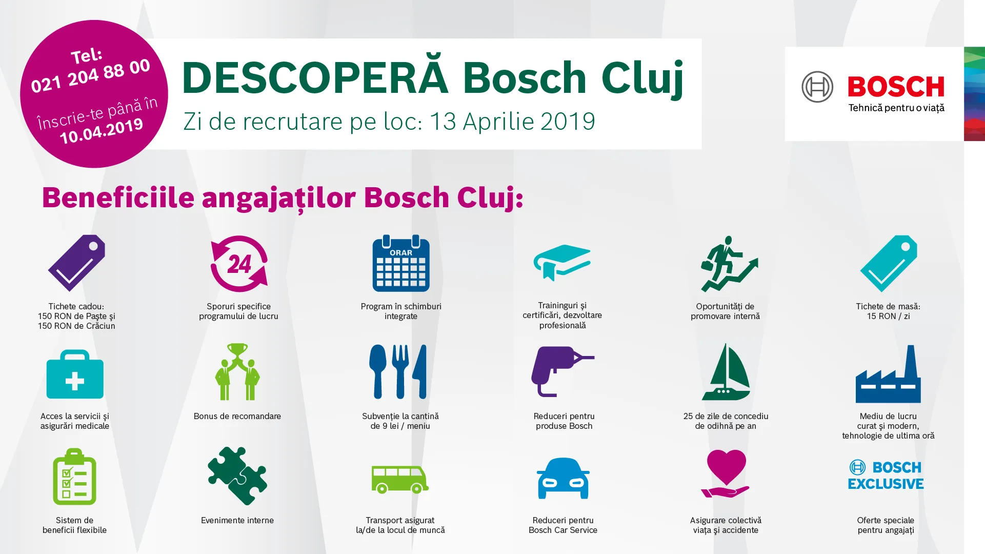 Pentru cei interesaţi să se alăture echipei Bosch Cluj, care nu pot fi prezenţi la eveniment, compania organizează interviuri de angajare în fiecare zi de luni și joi.