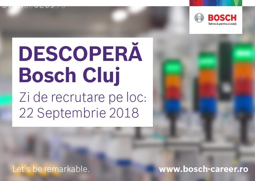 Evenimentul “DESCOPERĂ Bosch Cluj - Zi de Recrutare” este dedicat persoanelor interesate să lucreze în producție, în cadrul fabricii Bosch din Jucu, dar si celor care sunt interesați să afle mai multe despre activitatea companiei.