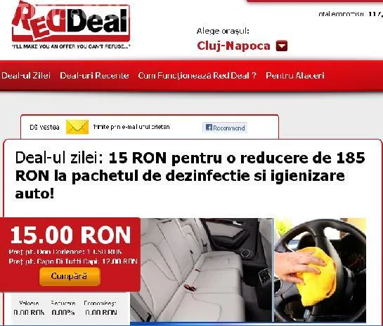 Cu 15 RON beneficiati de o reducere de 185 RON la pachetul de dezinfectie si igienizare auto. Astfel, daca prezentati cuponul Red Deal, veti obtine pachetul complet la doar 105 RON fata de 290 RON.