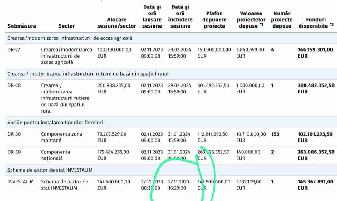 În tabelul retras de Barbu, se vede foarte clar că, pentru INVESTALIM sumele alocate sunt identice cu plafoanele de depunere, adică 147.500.000 milioane euro. Nu este ca la celelalte submăsuri, unde plafoanele de depunere sunt 150% față de sumele alocate.