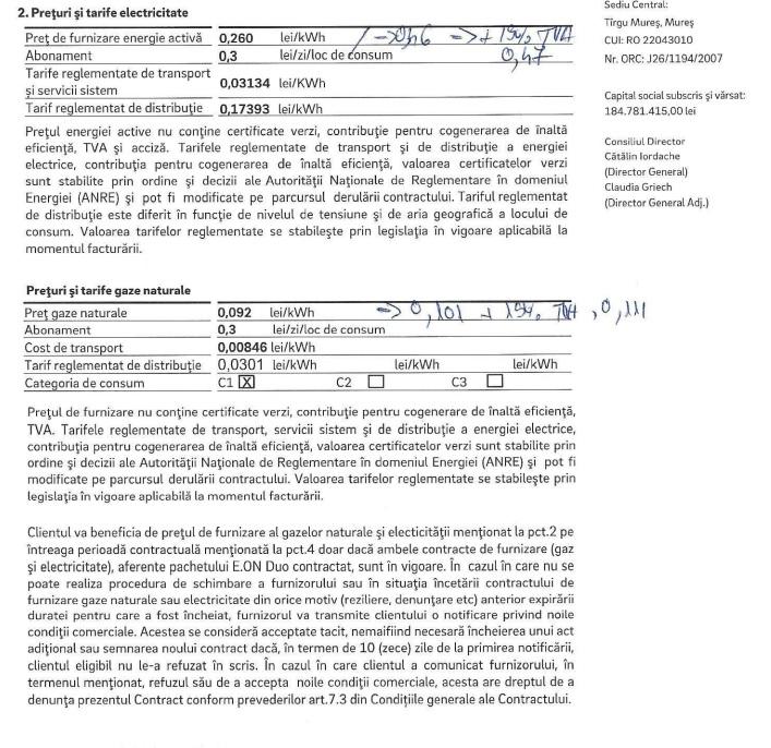”Am decis asupra semnării unui contract (pe doi ani, de către mama mea) cu E-ON, firmă care ne livra deja gazele naturale, care a părut - aș exagera în mod sincer să spun cea mai serioasă - dar în orice caz cea mai puțin neserioasă firmă din domeniu. Tot acest timp investit de mine timp de două luni, și garanțiile primite din partea firmei E-ON (am fost de față la semnarea contractului, și asigurat și eu, ulterior și mama mea de acest lucru - mai exact de avantajul PREȚURILOR FIXE/STABILE de care vom beneficia pe durata contractului - în mod repetat, inclusiv în convorbiri telefonice care au fost înregistrate) s-a transformat în timp irosit și, din nou BĂTAIE DE JOC CRASĂ la adresa mea și a părții contractante ca client când, vinerea trecută, mama mea a primit un Act adițional (mai exact o somație, în conținutul său - atașat mai jos) care ne anunță creșterea cu un PROCENT SUBSTANȚIAL MAI MARE DE 100% (mai mult decât DUBLAREA) a prețurilor la electricitate și gaze naturale, în cadrul aceea ce se pretinde a fi ACELAȘI CONTRACT. Mă întreb, cred pe bună dreptate, care mai este în acest caz „avantajul” pe care în am/avem în urma semnării contractului tip abonament (precedat de cele două luni de documentare despre care v-am relatat) față de cei care au rămas cu vechile contracte prelungite automat, fără să-și bată capul - avantaj de care am fost ASIGURAȚI, și pe care ni l-au GARANTAT, tuturor celor care au efectuat demersuri similare cu ale mele/mamei mele AUTORITĂȚILE STATULUI ROMÂN?”, ne-a relatat clientul.