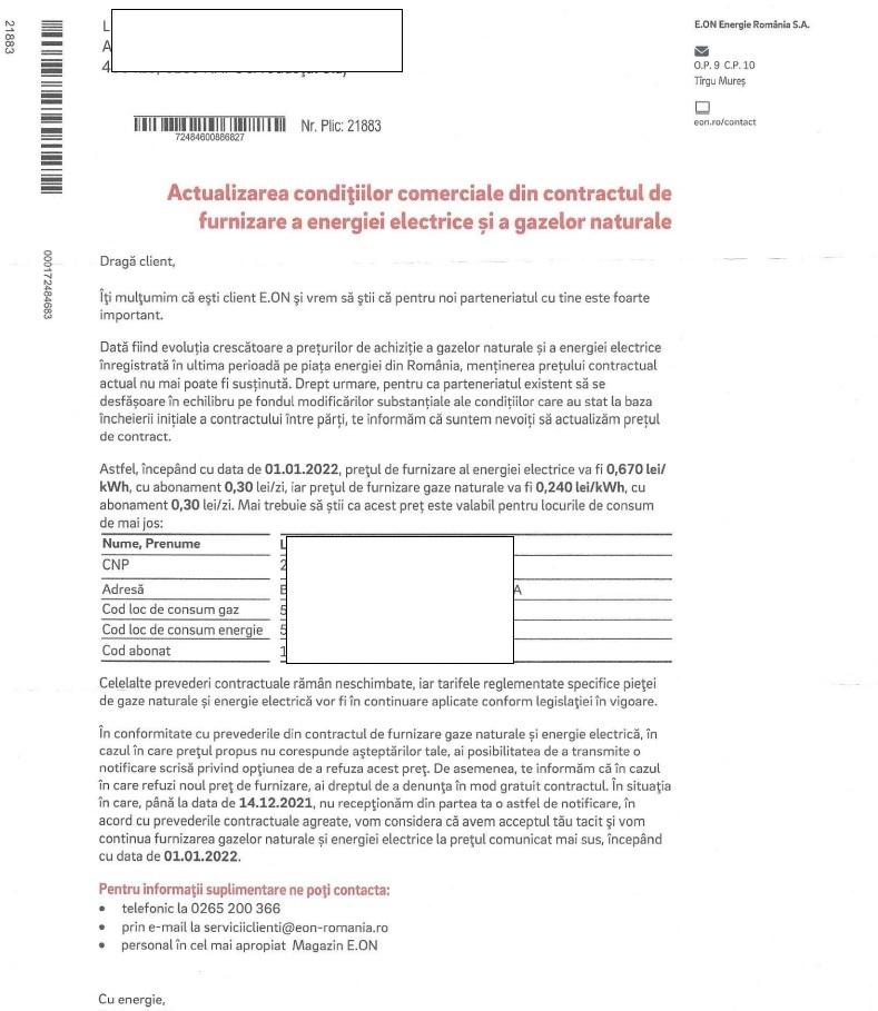 Un clujean s-a trezit acasă cu o adresă de la E-ON Energie România, prin care este informat că din 1 ianuarie prețul la care sunt livrate gazele naturale crește de 2,6 ori, iar pentru electricitate de 2,57 ori.
