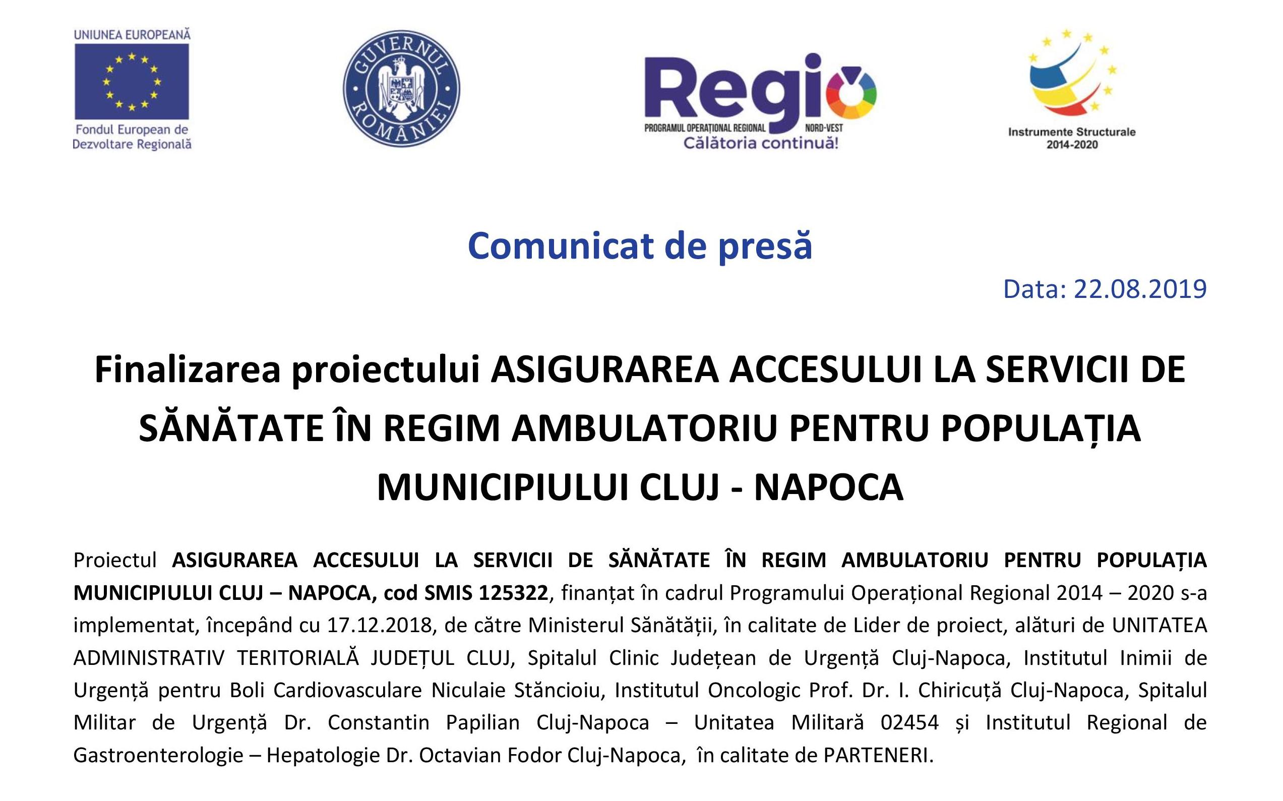 Finalizarea proiectului ASIGURAREA ACCESULUI LA SERVICII DE SĂNĂTATE ÎN REGIM AMBULATORIU PENTRU POPULAȚIA MUNICIPIULUI CLUJ - NAPOCA