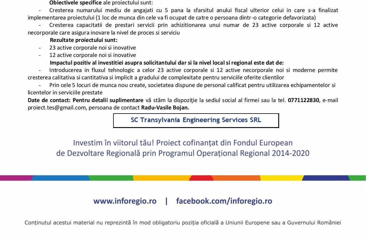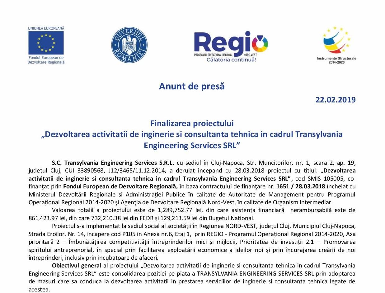 Finalizarea proiectului „Dezvoltarea activitatii de inginerie si consultanta tehnica in cadrul Transylvania Engineering Services SRL”