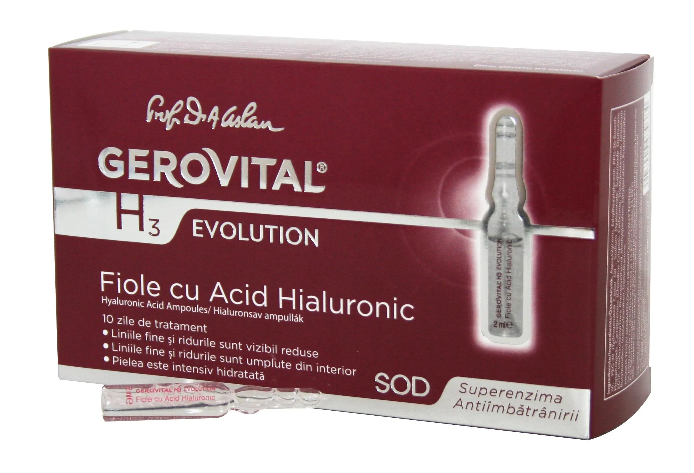 Fiolele cu acid hialuronic Gerovital H3 Evolution au fost create de specialiștii Gerovital special pentru a ajuta tenul să facă față efectelor trecerii timpului. Având la bază o formulă inovatoare, produsul conține un ser bogat în Superoxid Dismutazǎ şi Acid Hialuronic pur şi liposomal, elemente unice cu efect intense de hidratare şi de netezire a ridurilor. Acidul Hialuronic pur acţionează dual, atât prin refacerea, cât și prin diminuarea pierderilor de apă, iar lipozomii cu Acid Hialuronic pătrund în piele şi umplu ridurile din interior, astfel încât ridurile şi liniile fine sunt mult diminuate. Folosite cu regularitate, fiolele cu acid hialuronic duc la reducerea vizibilă a ridurilor adânci. Acestea se aplică dimineaţa sau seara, în cure de câte 10 zile de tratament, prin aplicarea conţinutului unei fiole pe faţa proaspăt demachiată, prin masaj uşor. Pentru efecte de durată, tratamentul se utilizează lunar.