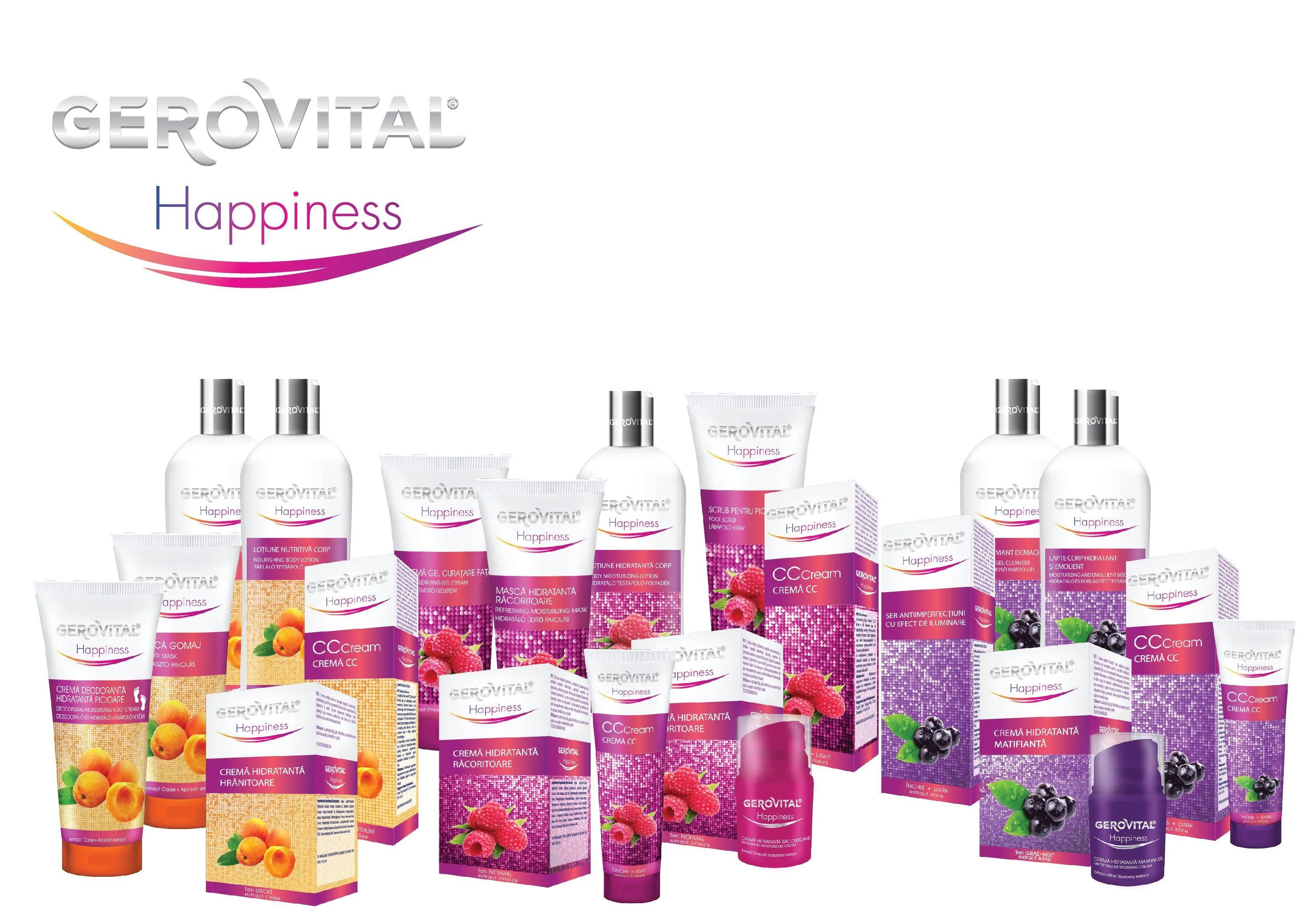 Lansată pe piață în februarie 2015, Gerovital Happiness se adresează persoanelor 16+ ani, dar este potrivită și pentru tenurile mature. Gama cuprinde 17 produse cosmetice pentru față și corp, împărțite în trei subgame, în funcție de principiul activ conținut (zmeură, afine și caise). Noutatea absolută este reprezentată de cremele „Color Control” (CC), disponibile în trei nuanțe: deschis, mediu și închis. Îmbogățite cu pigmenți naturali și extracte de fructe, adaptate fiecărui tip de piele, cremele CC Gerovital Happiness estompează eficient imperfecțiunile și urmele de oboseală, oferind tenului un aspect plin de strălucire.