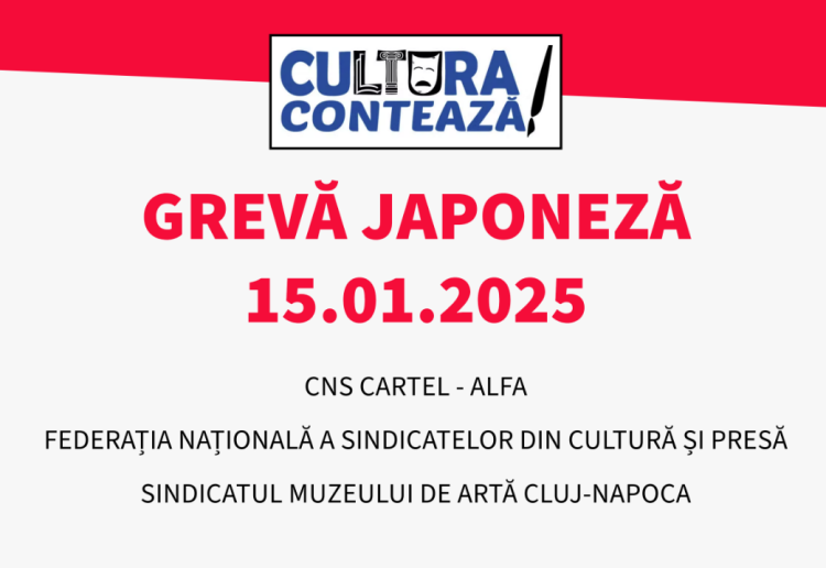 Cu ocazia Zilei Culturii Naționale, sindicatul Muzeului de Artă Cluj-Napoca va participa la o grevă de tip japonez, pentru a atrage atenția asupra problemelor grave cu care se confruntă sectorul cultural, dar și asupra condițiilor precare în care lucrează angajații din acest domeniu. Sindicaliștii subliniază că lipsa de finanțare și deprofesionalizarea reprezintă un pericol real într-o societate în care valorile culturale sunt adesea înlocuite de non-valori, iar mediocritatea este promovată în locul excelenței.