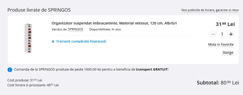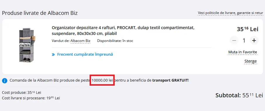Un comerciant de pe emag a atras atenția clienților cu o ofertă ”greu” de refuzat. Firma vinde un organizator cu patru rafturi, care costă 35 de lei, dar transportul este gratuit numai în condiții speciale.