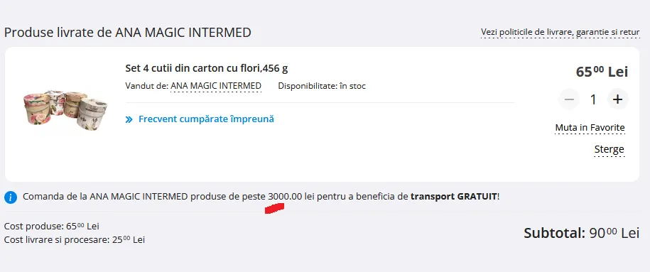Acesta nu este un caz singular. Alte firma oferă transport gratuit numai la comenzi de 3000 de lei sau de 1000 de lei, adică sume foarte mari.