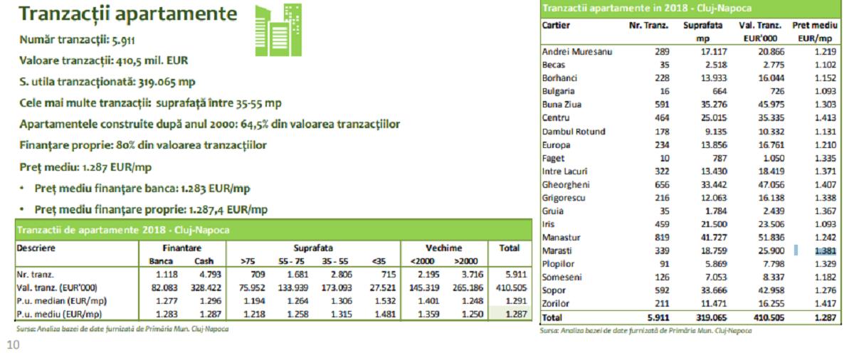În 2018, în Cluj-Napoca s-au tranzacționat 5.911 cu o valoare totală de 410,5 milioane de euro. Cele mai ”vânate” au fost apartamentele mici, cu suprafețe între 33-55 de metri pătrați.